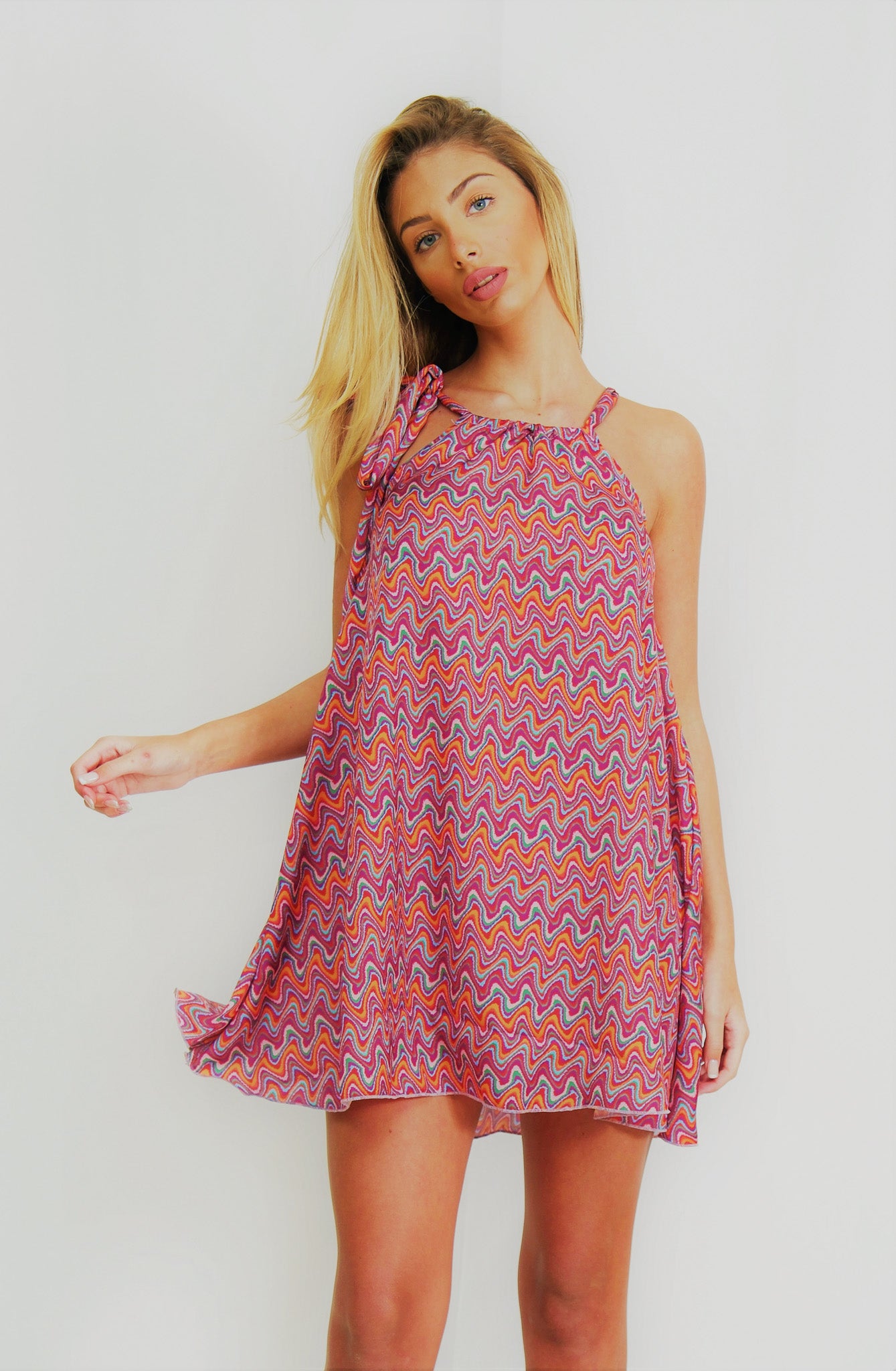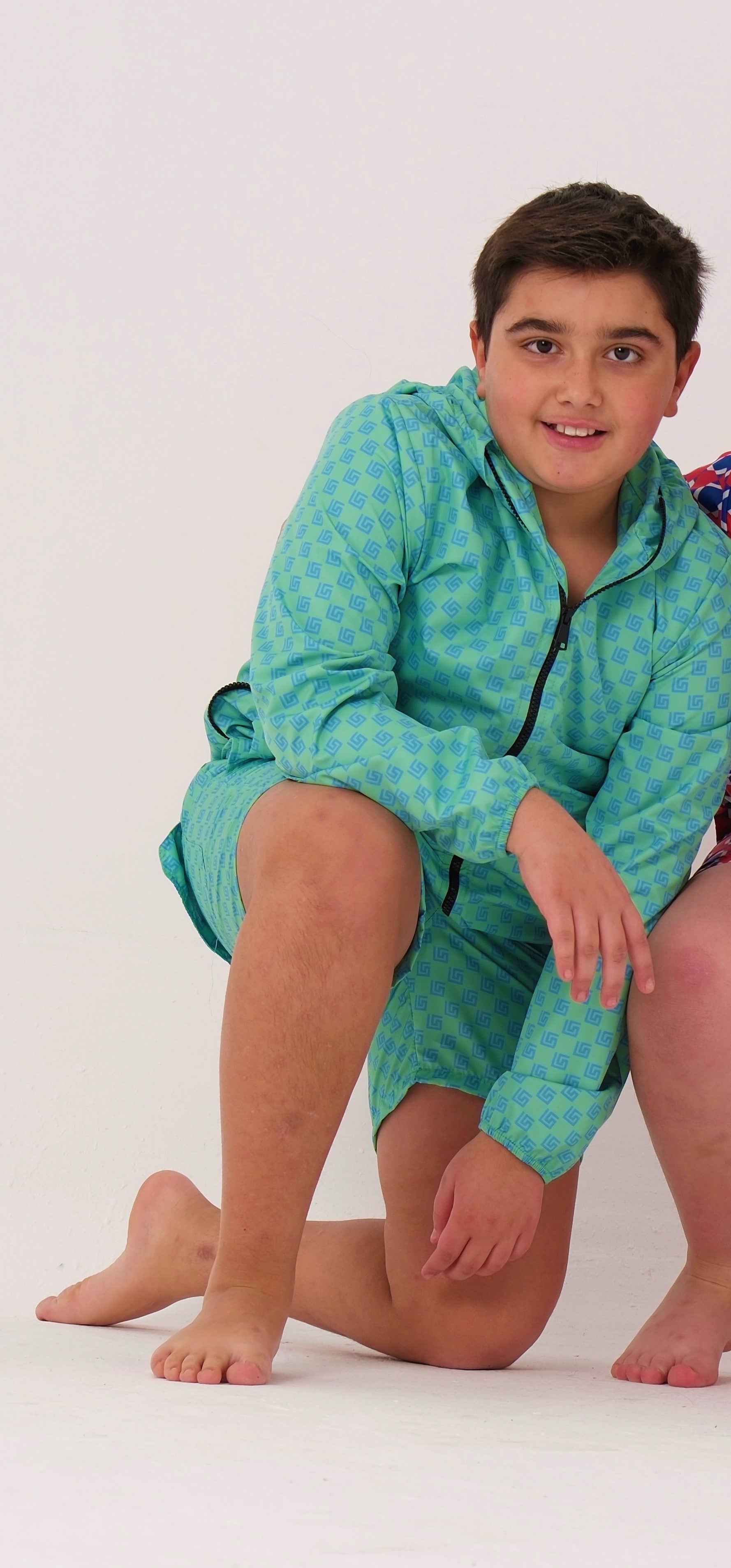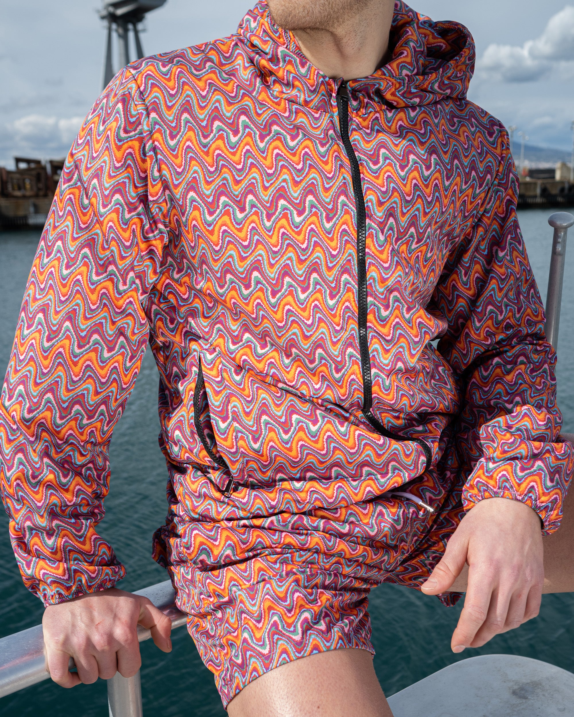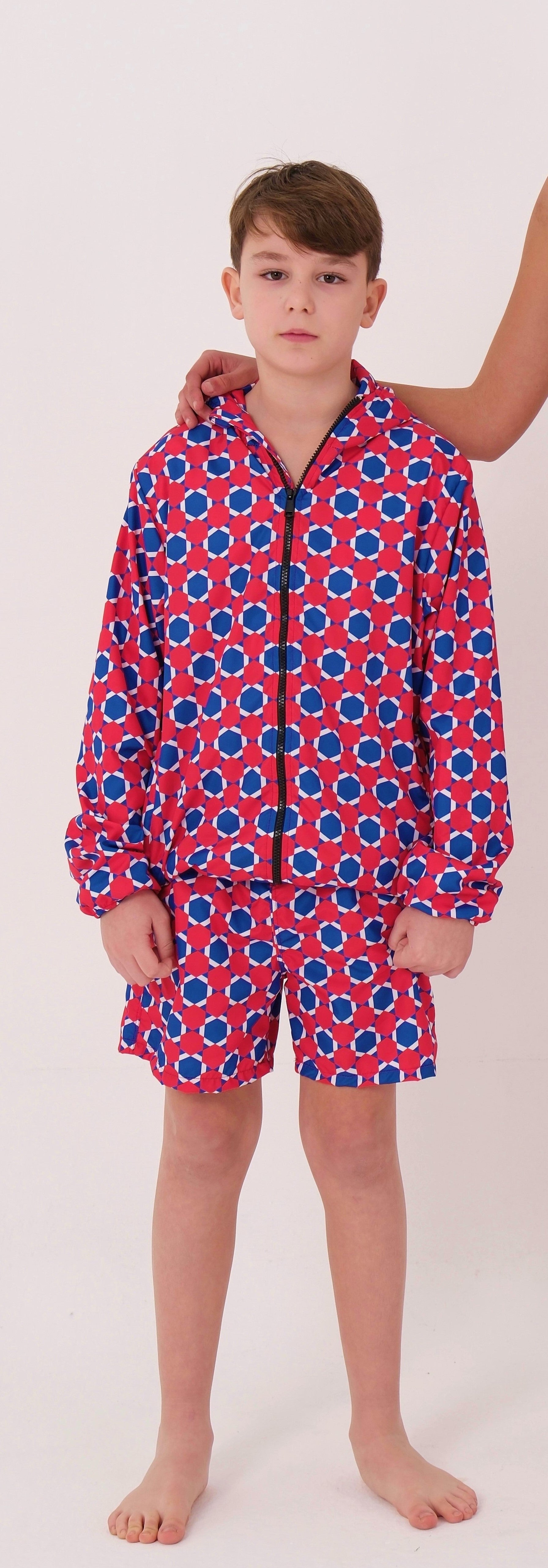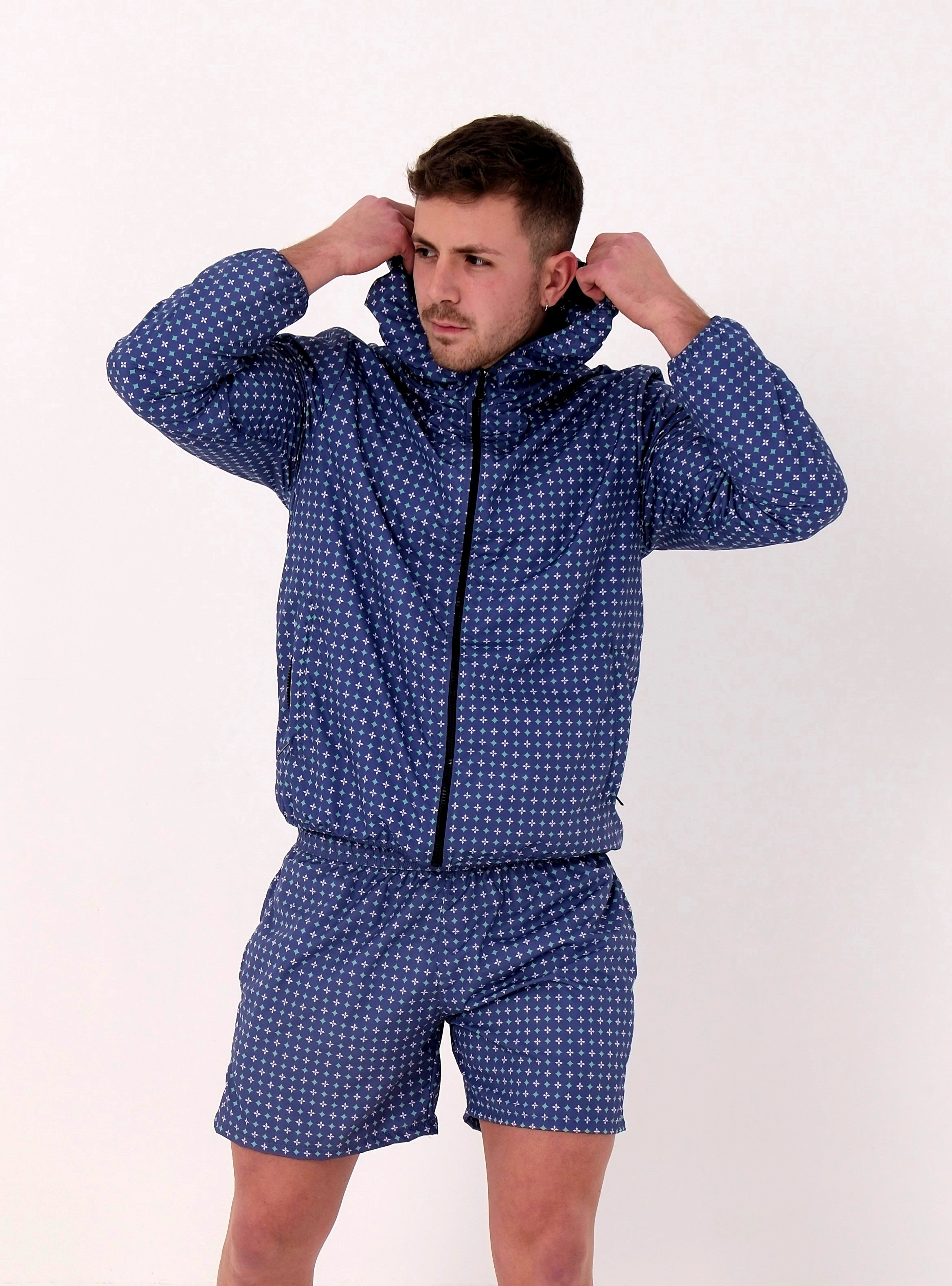 K-way in tessuto fantasia con cappuccio e tasche laterali, chiusura con